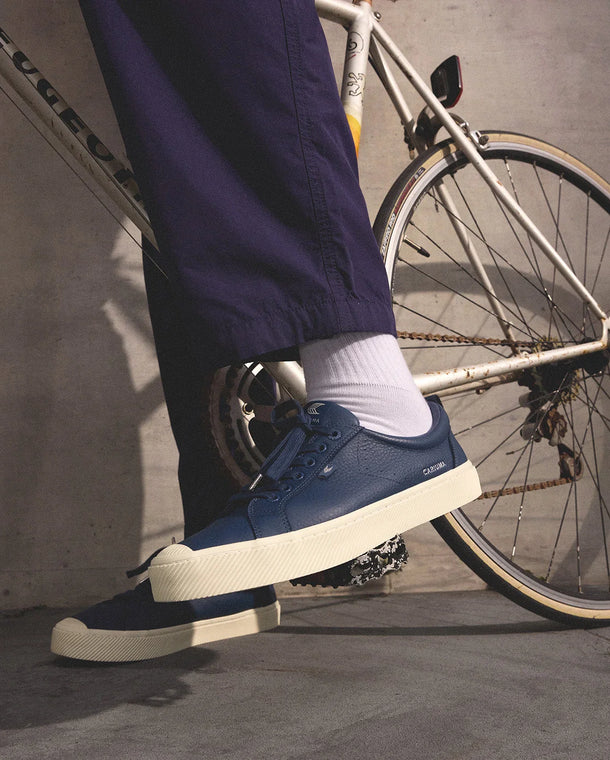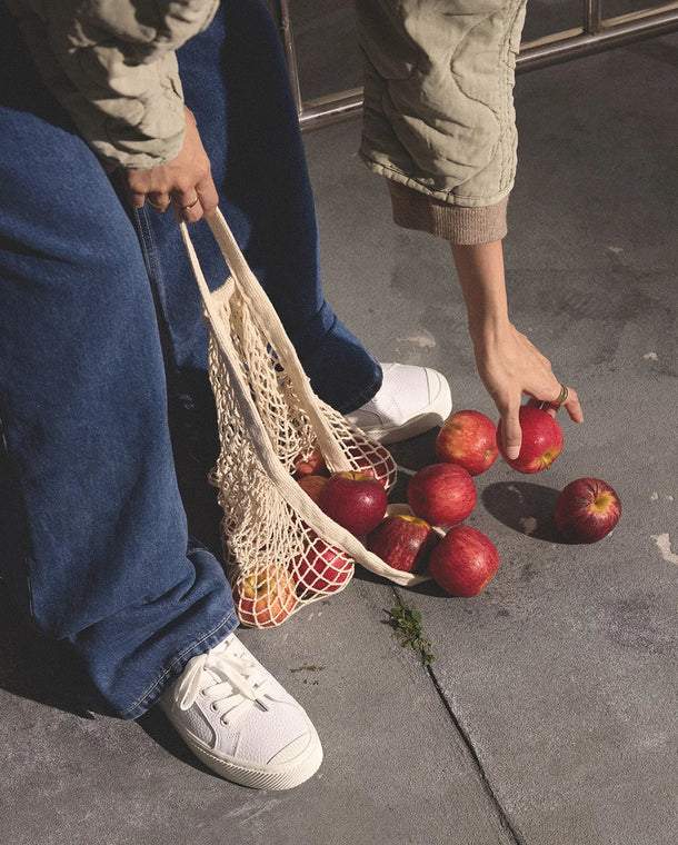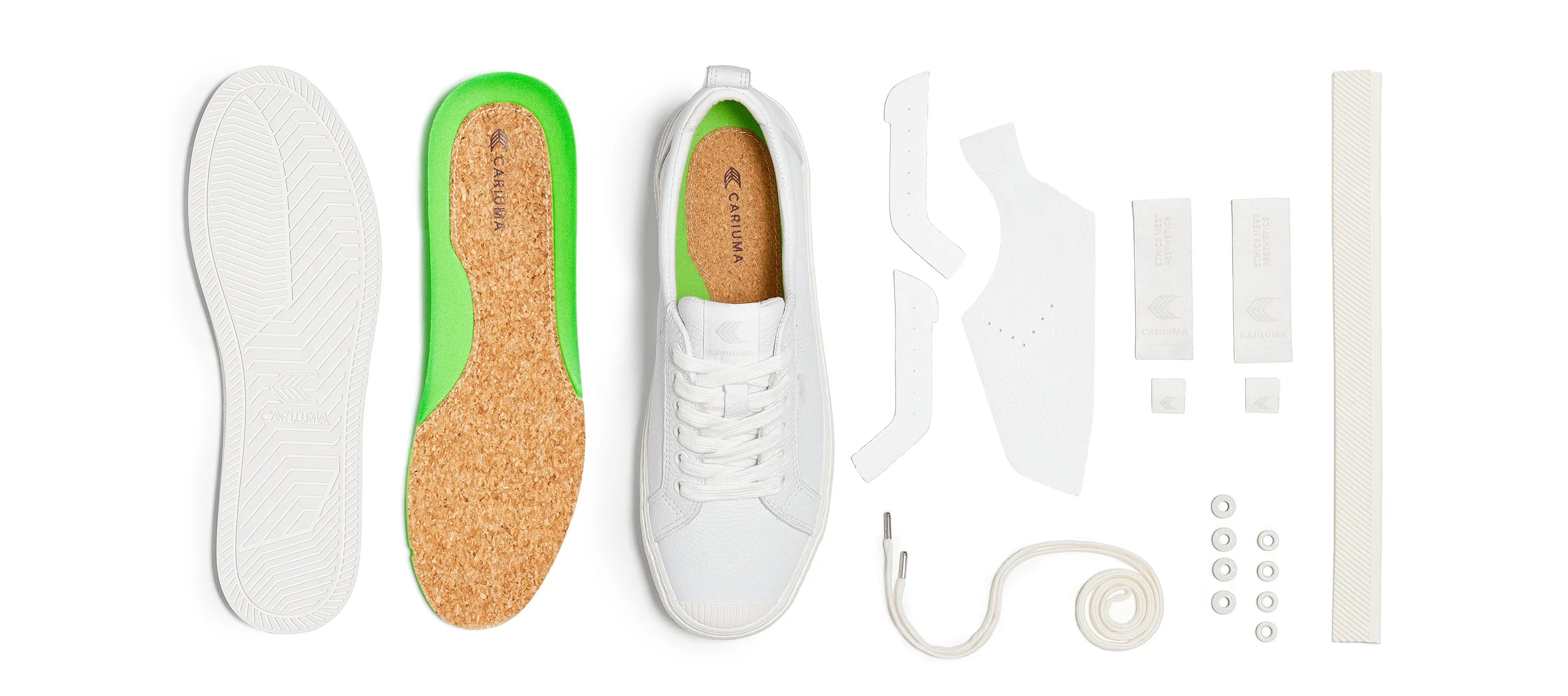 ● 鞋面:採用來自 LWG 金級認證製革廠的高級荔枝紋皮革製成● 內襯:有機棉帆布● 鞋底:防滑橡膠● 鞋墊:軟木搭配可再生蓖麻油製成的生物基泡棉● 鞋帶:由再生聚酯纖維(rPET)與有機棉混紡製成,搭配壓印金屬鞋帶頭● 製作工藝:硫化鞋結構,鞋底採全縫線設計