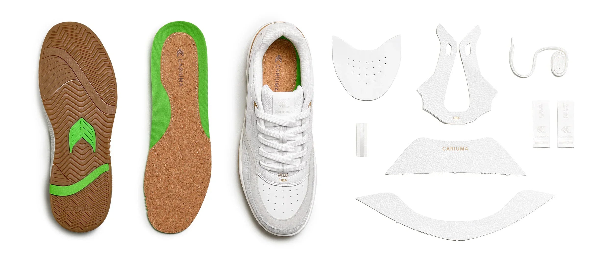 ● 鞋面:採用來自 LWG 金級認證製革廠的高級皮革● 內襯:再生網布● 鞋底:防滑橡膠● 中間緩衝層:以甘蔗為原料製成的綠色環保 EVA● 鞋墊:軟木搭配可再生蓖麻油製成的生物基泡棉● 鞋帶:使用再生聚酯纖維(rPET)製成● 結構設計:杯型大底結構(Cupsole)